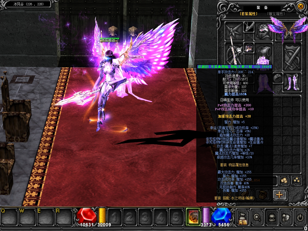 | 黑暗套 | 黑暗天使魔杖+雷之项链(黑暗) 、黑暗天使之剑+火之项链(黑暗)、黑暗天使权杖+风之项链(黑暗)、黑暗天使之杖+水之项链(黑暗)、黑暗天使之弓+紫晶项链(黑暗)、黑暗天使魔法之剑+冰之项链(黑暗) | 1500元宝 |